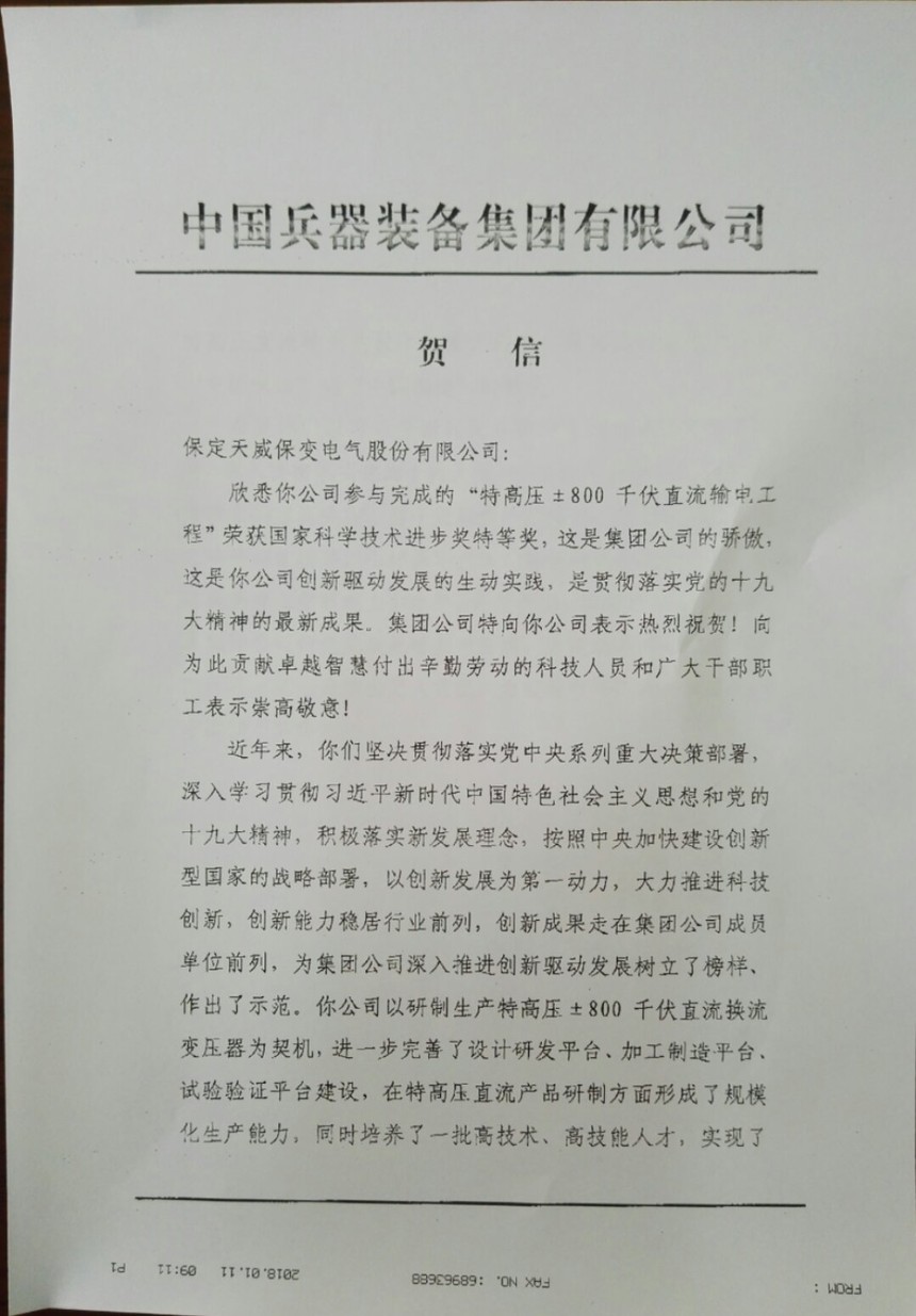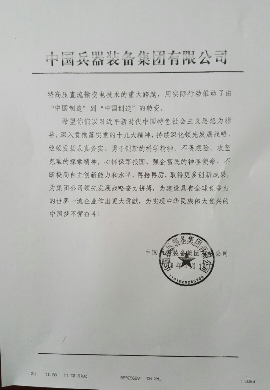 欣悉你公司参与完成的“特高压±800千伏直流输电工程”荣获国家科学技术进步奖特等奖,这是集团公司的骄傲,这是你公司创新驱动发展的生动实践,是贯彻落实党的十九大精神的最新成果。集团公司特向你公司表示热烈祝贺!向为此贡献卓越智慧付出辛勤劳动的科技人员和广大干部职工表示崇高敬意!