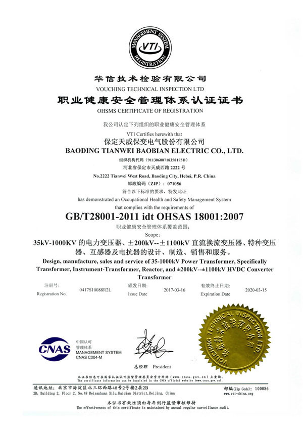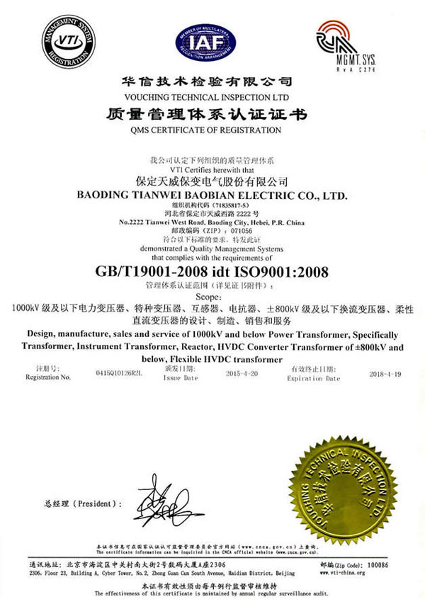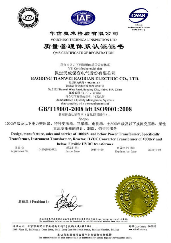 保变电气公司建立并实施规范的质量管理体系,于1996年取得了ISO 9001:1994质量体系认证证书;2003年通过转版实现了ISO9001:2000质量管理体系认证。2004年、2007年两获河北省质量管理奖,2005年获国家出口免验证书,通过国家实验室认证。2006年通过国家产品认证并被中国工业经济联合会评定为中国变压器、整流器、互感器制造行业排头兵企业。2010年通过了ISO9001:2008转版质量管理体系认证。